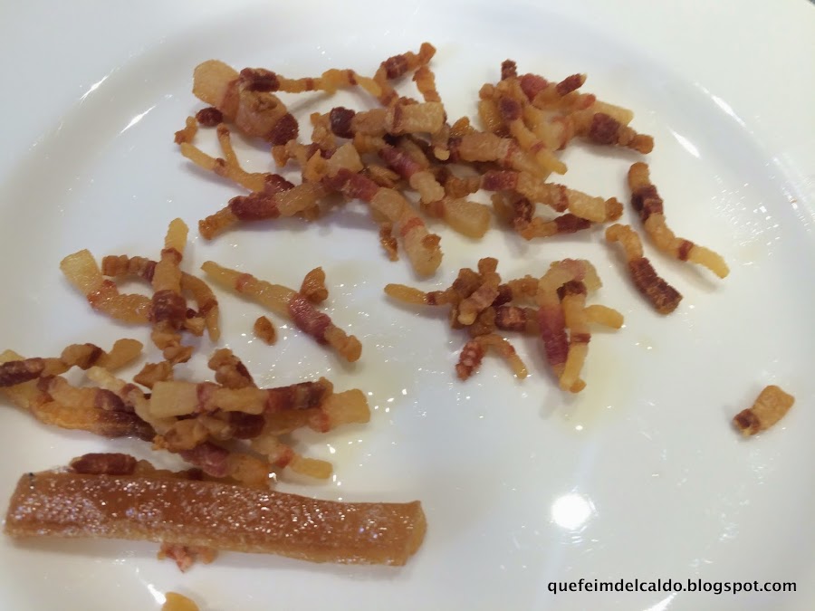 En primer lugar preparamos el tocino ibérico ahumado, le quitamos la corteza y cortamos el tocino en tiras de unos 4 centímetros de largo y 0,5 mm de grosor.