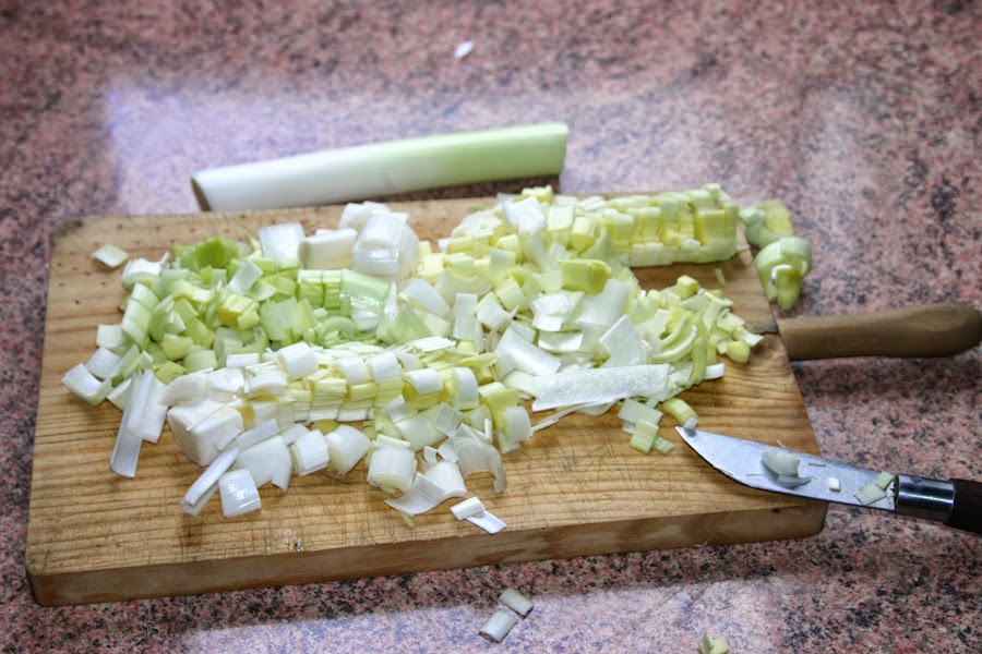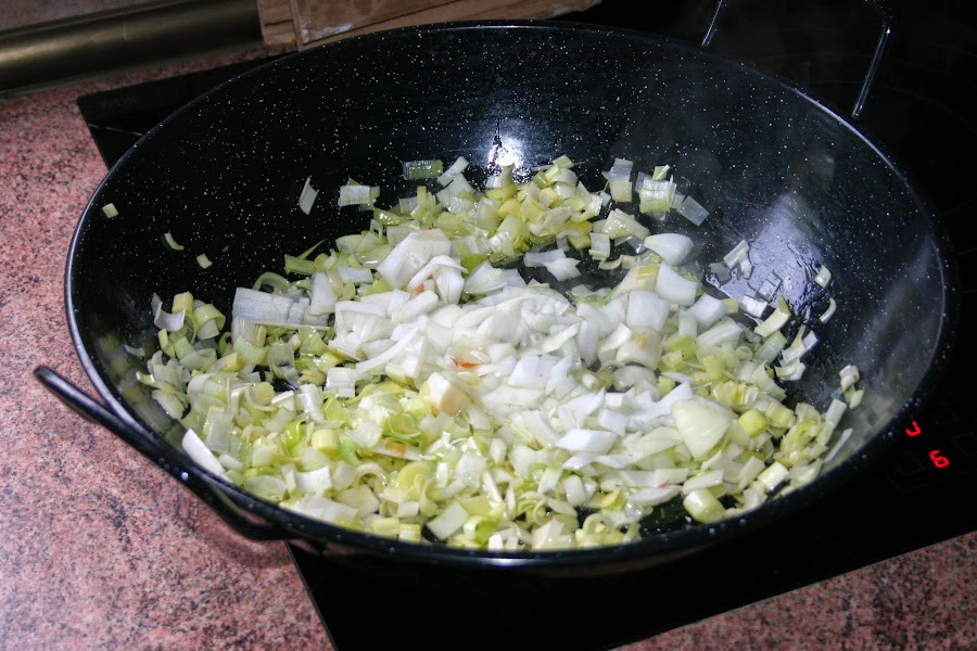 en una fuente grande ponemos aceite y echamos los puerros y la cebolla para sofreirlo