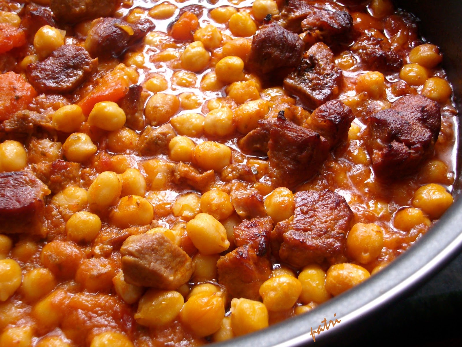 500 gr de paletilla de cerdo deshuesada y en trozos pequeños,100 gr de tomate sofrito casero ó pure de tomate,1 cebolla grande,2 zanahorias,500 gr de garbanzos cocidos,aceite de oliva,sal,pimenton,1 cuchardita de hojas de tomillo seco,1 hoja de laurel,1 vasito de vino,1 vasito de agua1/2 k. de paletilla de cerdo deshuesada y en trozos pequeños