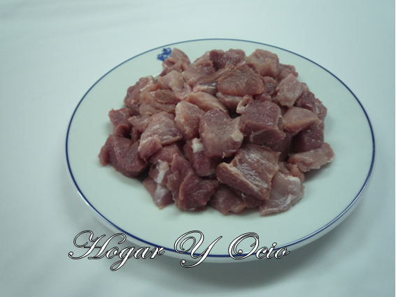 1. Con un cuchillo quitamos las grasas visibles de la carne si las hubiera. A continuación, cortamos la carne en dados.