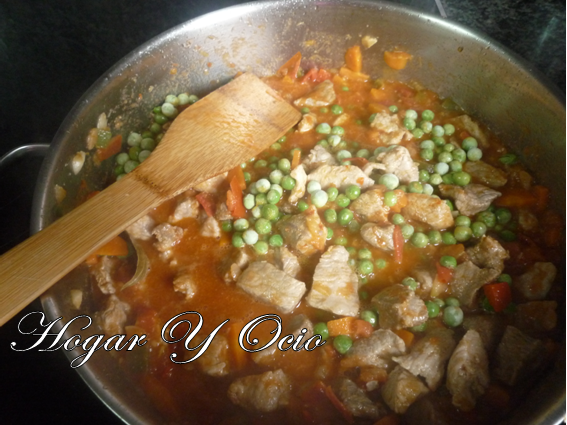 4. Cuando los tomates estén bastante deshechos incorporamos la carne, echamos el pimentón dulce, lo mezclamos bien, e inmediatamente añadimos el vino para que el pimentón no se queme y no amargue. A continuación, echamos los guisantes y una hoja de laurel.