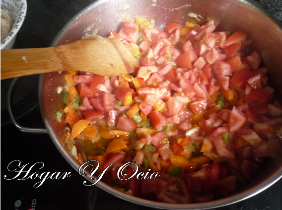 3. Pelamos y picamos la cebolla y los ajos. Los rehogamos con el mismo aceite de la carne. Cuando comienzen a estar blanditos, añadimos la zanahoria y los pimientos bien picaditos. Dejamos cocinar unos minutos y agregamos los tomates cortados en dados, o si lo preferís rallados. Durante todo el proceso hay que tener cuidado de que no se pegue nada.