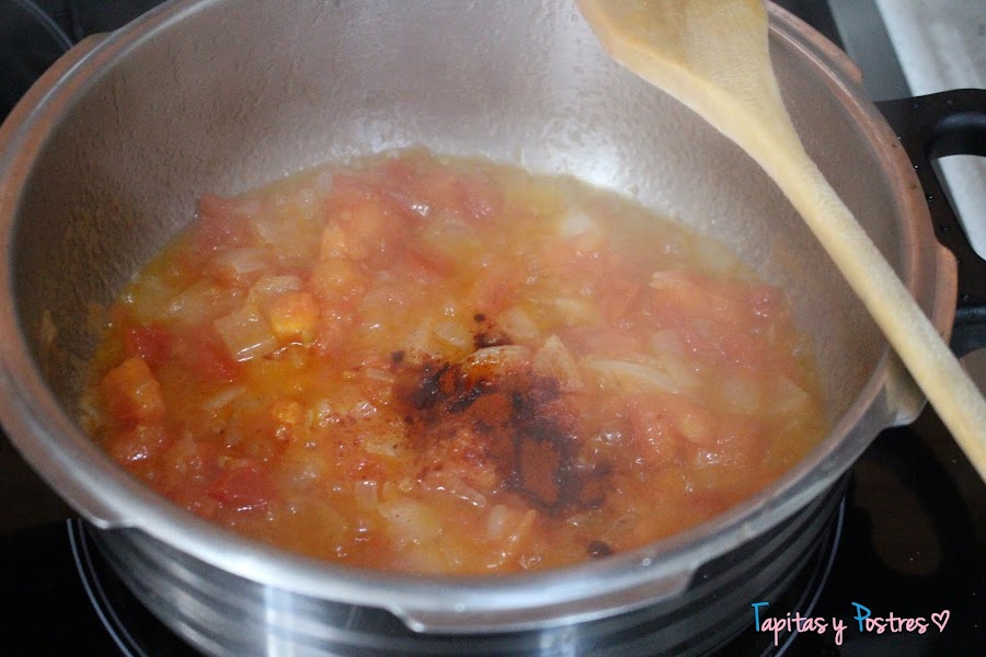Una vez listo el sofrito, añadimos el pimentón y removemos.