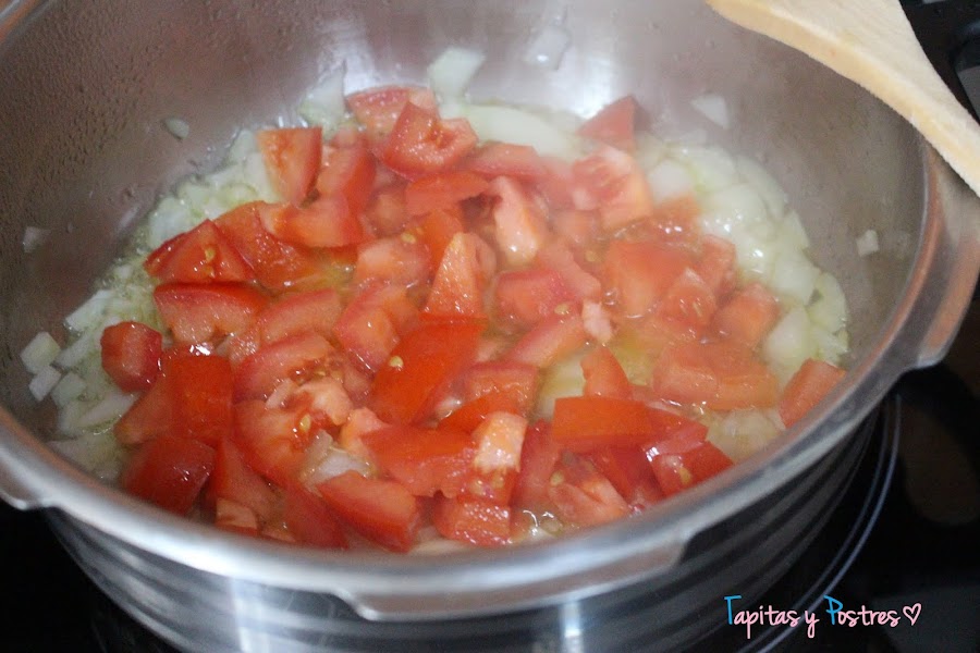 Cuando esté transparente añadimos los tomates y sofreímos.