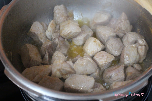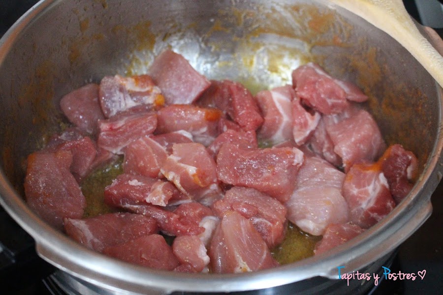 Volvemos a poner un fondo de aceite en la olla a calentar y añadimos la carne de cerdo que habremos salpimentado previamente. Damos vueltas para que la carne se haga un poco.