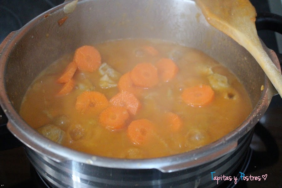 Troceamos la zanahoria y la añadimos. Cerramos la olla y cocinamos unos minutos.