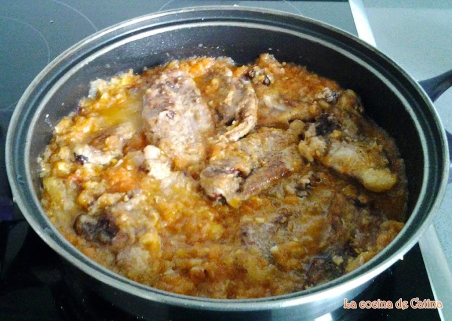 Cuando empiece a hervir echamos el majado que teníamos reservado, movemos bien, rectificamos de sal y pimienta y cocemos a fuego lento hasta que la carne esté tierna.