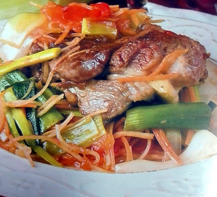 Pelamos las verduras y las lavamos bien. Las zanahorias y el apio los cortamos en bastoncillos ( o juliana ), las cebolletas y los ajetes en trozos de unos 3 cm. Las freímos en la misma sartén donde la carne . A mitad de cocción, cuando ya se han ablandado un poquito, le añadimos los tomates cortados en dados y el vino blanco . Salpimentamos al gusto.