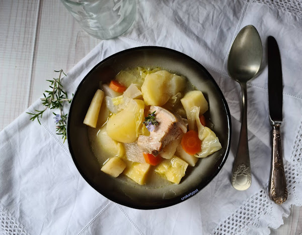 Para el estofado: 3 patatas, 1 nabo, 2 chirivías, 1 puerro , 1 cebolla, 1 chalota, 300 gr. col repollo, vino blanco seco (he utilizado verdejo), y romero. Aceite de oliva (aove)
