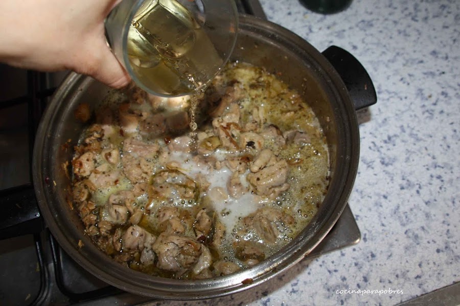 Incorporamos entonces al gua y la sidra, dejamos cocinar a fuego suave hasta que se haya consumido por completo el líquido.