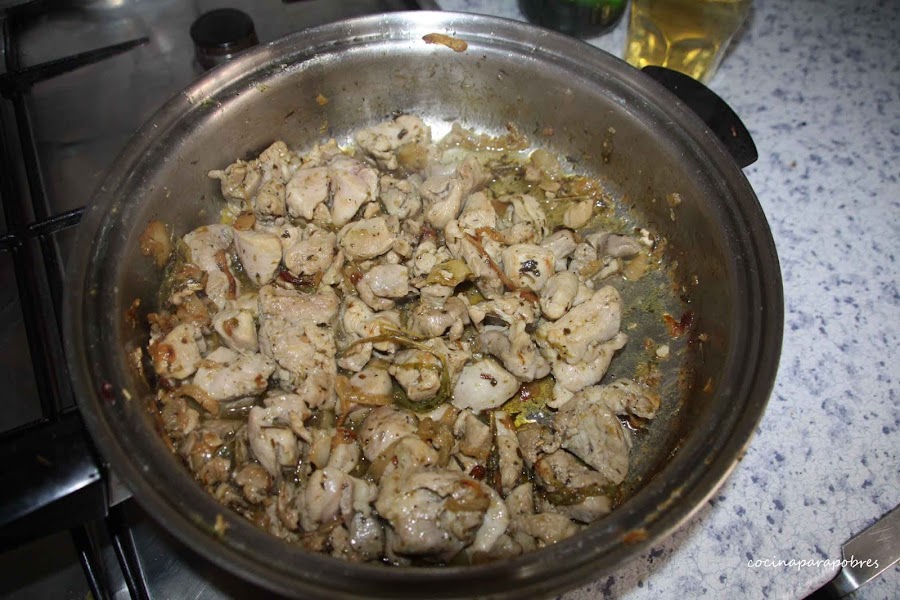 Dejamos al fuego hasta que se hagan bien, incorporamos entonces las especias, sal y la carne, mezclamos para que esta se impregne de sabor y dejamos a fuego medio unos minutos.