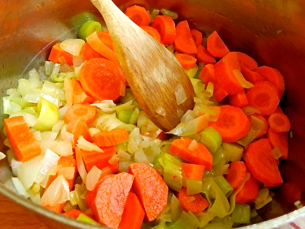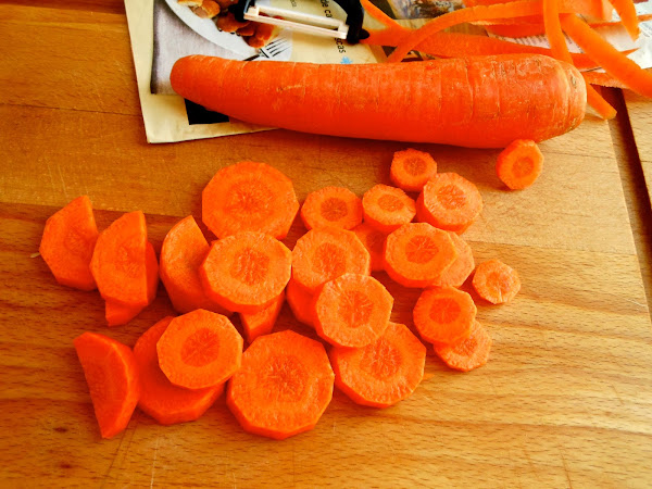 Seguidamente pela con la ayuda de un pela-verduras o un cuchillo pequeño y afilado las zanahorias y pícalas en aros.