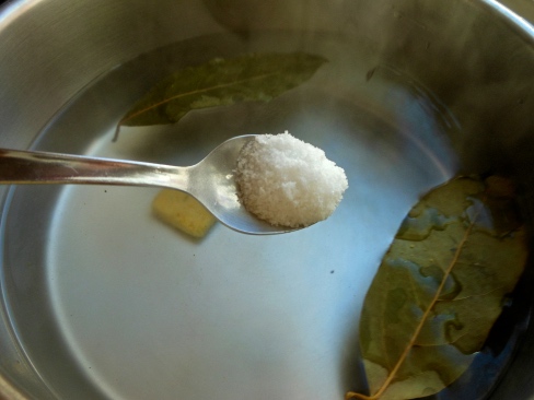 Cuando el agua rompa a hervir añade a la cacerola las dos hojas de laurel, la pastilla de caldo de pollo, la cucharadita de sal fina y el arroz basmati. Remueve bien el contenido hasta que la pastilla de caldo se haya desecho y deja cocer el arroz a fuego fuerte durante 12 minutos.