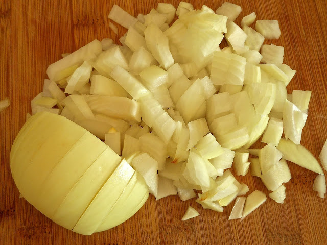Mientras tanto pela, descorazona y pica la manzana en dados.