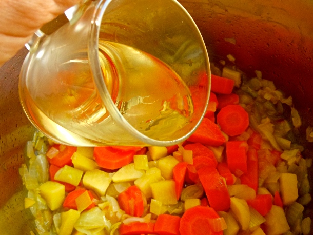 Transcurrido el tiempo vierte el medio vaso de vino blanco seco, remueve con tu cuchara de madera y deja que el contenido de la cacerola hierva a fuego fuerte durante 2-3 minutos. Realiza esta operación con la cacerola destapada.