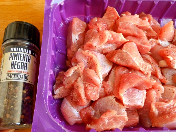 Comienza espolvoreando los trozos de carne de pavo con pimienta negra molida.