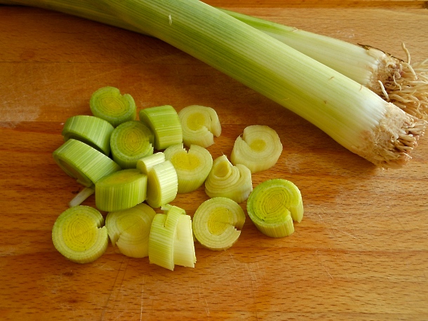 Tras esto corte la parte terrosa del puerro, hazle un corte a lo largo y enjuágalo bien bajo el chorro del agua fría del grifo así eliminaremos los restos de tierra que puedan contener, después sécalo con un trozo de papel de cocina y pícalo en aros.