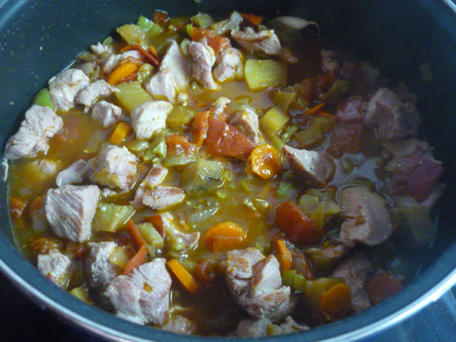 4.- Pasamos el pavo a un cacerola cuando este sellado y le agregamos las verduras pochaditas.
