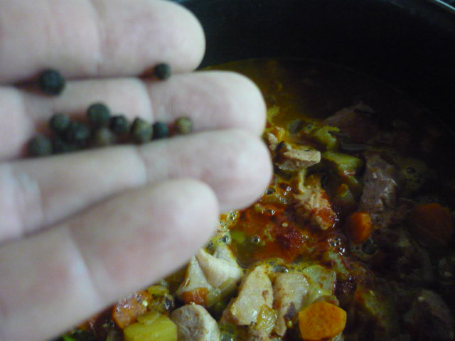 5.- Sumamos la cerveza, el pimentón de la vera, los granos de pimienta un poco de sal y cubrimos con agua.