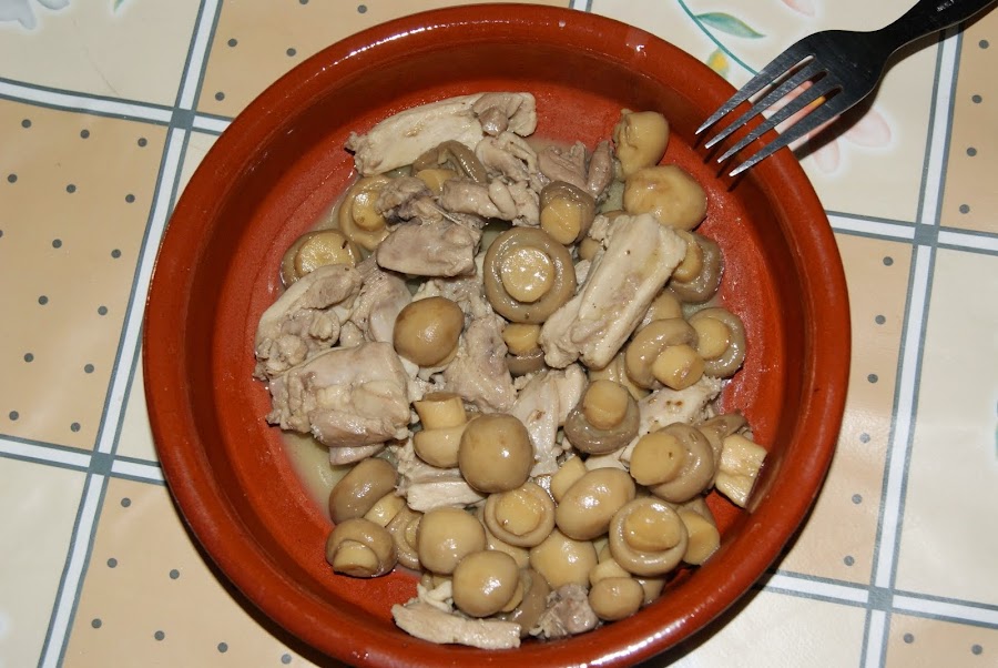 Echamos aceite en una cacerola (lo suficiente para cubrir el fondo) y lo ponemos a calentar. Deshuesamos los contramuslos y los cortamos en trozos pequeños. Salteamos el pollo unos 5 minutos en la cacerola, añadimos el orégano y el tomillo, la sal y el vino blanco. Lavamos muy bien los champiñones y los añadimos al guiso. Cubrimos con el agua y lo dejamos hervir a fuego fuerte 20 minutos.