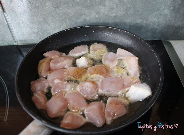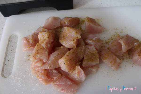 Salpimentamos los trozos de pechuga y los espolvoreamos con un poco de comino molido. Los doramos en una sartén y los reservamos.