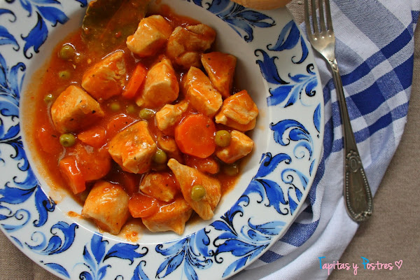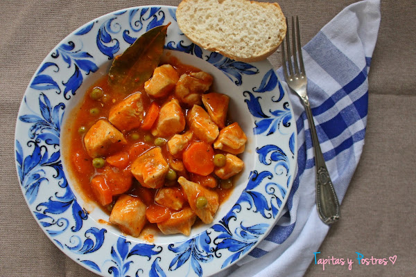 A veces uso ternera, pero en casa les gusta mas con cerdo. Pero en estos días en los que salir a la compra lo he limitado a un día a la semana, a veces me quedo sin ingredientes y hay que tirar de lo que tengamos en la nevera o en el congelador. En este caso, era pechuga de pollo. Así que el estofado de siempre lo hemos hecho con pollo.