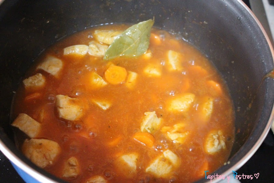 En la cazuela ponemos el pollo y el sofrito. Agregamos el vino blanco y medio vaso de agua. Añadimos la pastilla de caldo desmenuzada, la zanahoria en rodajas, la hoja de laurel y medio vaso de agua. Dejamos que cueza a fuego medio unos 15 o 20 minutos, hasta que la zanahoria esté tierna.