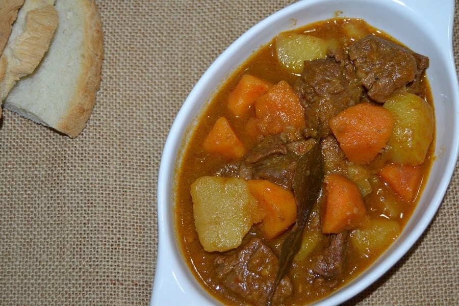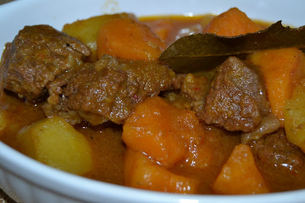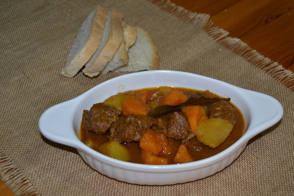 Allí precisamente compré esta carne de la que salio un guiso delicioso y con un sabor extraordinario, y como estamos en temporada de boniatos pensé que le iría bien este acompañamiento junto con patatas a partes iguales.