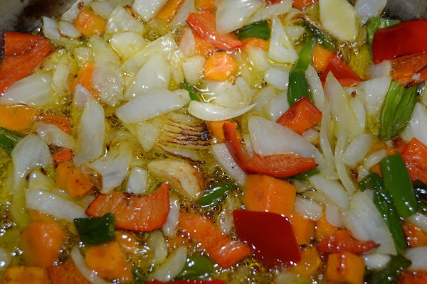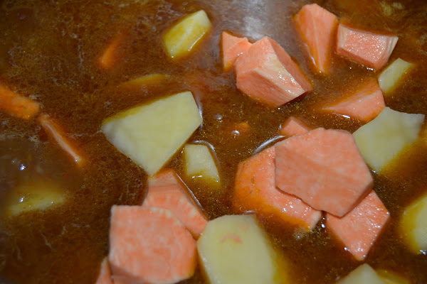 Abrimos y echamos las patatas y los boniatos tronzados, y dejamos cocinar unos veinte minutos mas, ya sin la olla cerrada.