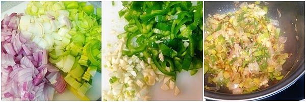 En primer lugar lavamos y cortamos las verduras. En una cazuela,(si es de barro mejor) calentamos el aceite de oliva y pochamos la cebolla, el puerro, pimiento verde y luego añadimos los ajos troceados.