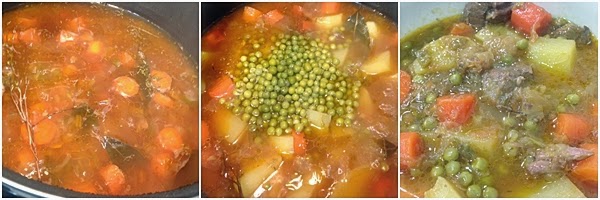 Tendremos preparadas las zanahorias cortadas, las añadimos y dejamos un rato, las patatas y los guisantes que agregamos al final, justo el tiempo para que quede cocido todo.