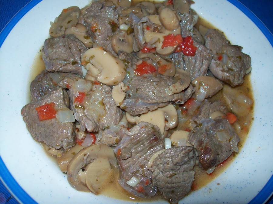 Añadimos la ternera y los champiñones laminados, mezclamos todo bien y echamos agua, sin llegar a cubrirlo del todo.
