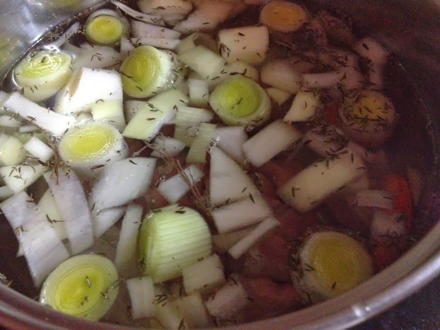 1.- En una olla calentamos 2 litros de agua con el vino blanco, la cebolla picada, la zanahoria troceada, el puerro troceado, la sal, el laurel, el tomillo, los dientes de ajos y la pimienta.