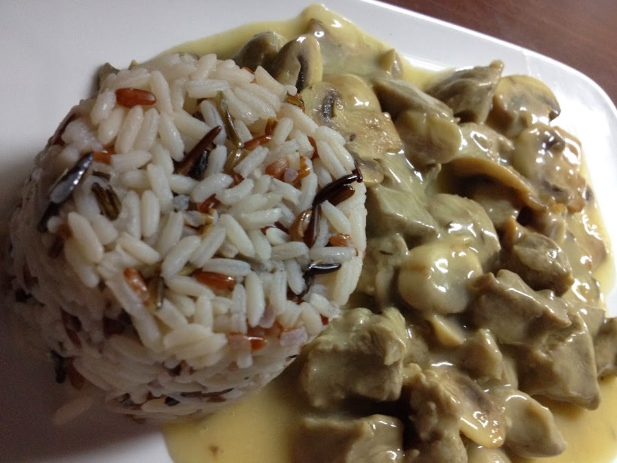 5.- Por último, añadimos la carne a la salsa y los champiñones. Dejamos al fuego sólo unos minutos y servimos con una guarnición de arroz. ( El caldo que nos ha sobrado, lo guardamos en un taper o lo congelamos si no lo vamos a utilizar enseguida. Nos vendrá muy bien para preparar otras comidas).