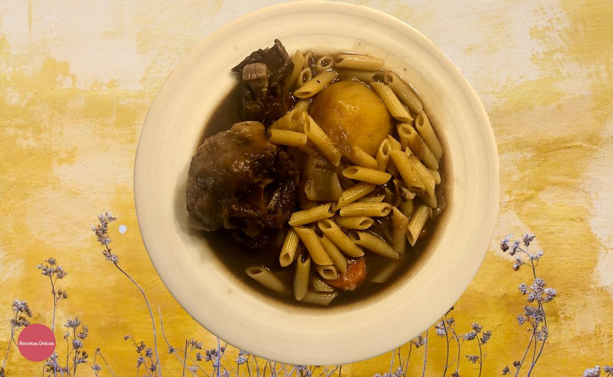 Cuando haya pasado el tiempo necesario para que la carne del rabo se desprenda con facilidad del hueso, comprobar que haya quedado líquido suficiente, y si no es así añadir más agua ,y echar los macarrones, tapar y cocer 8 minutos.