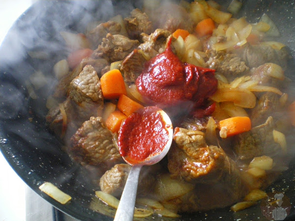 Sumamos a la cazuela el pimentón, el concentrado de tomate y sofreir durante otros 5 minutos.