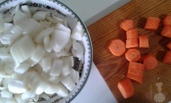 Pelar las cebollas y las zanahorias, cortarlas en dados pequeños.