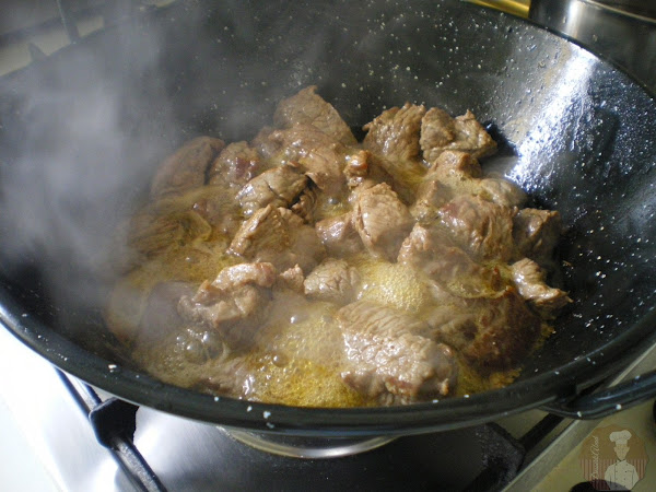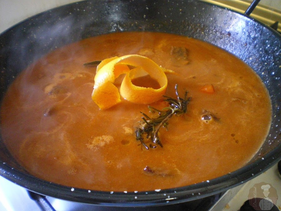 Es un plato muy sabroso y bastante sencillo de cocinar, la carne quede melosa y gracias a los condimentos, la salsa presenta un sabor intenso y el golpe final de romero y piel de naranja, es definitivo para convertirla en irresistible y peligrosa teniendo una hogaza de buen pan al mano.En lugar de un recipiente cerrado, he cocinado este estofado en lo que aquí en Andalucía solemos llamar perol, recurriendo a una tapa para hacer el "efecto olla" que todo buen estofado debe tener para aprovechar los jugos y aromas de la cocción a fuego lento, ya que se me apetecía estrenarlo precisamente por los recuerdos que este artilugio me trae de la niñez.