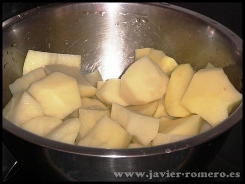 Una vez que ya está caliente le añadimos las patatas cortadas en cachelos, cubrimos de agua justo por encima de las patatas y lo ponemos a fuego medio bajo una vez que el agua haya roto a hervir, dejando que cuezan despacito.