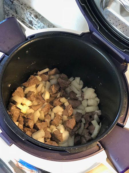 Ponemos la Olla Cookeo en modo Dorar con la tapa abierta y sofreímos un poco la carne de ternera y la cebolla cortada en trozos.
