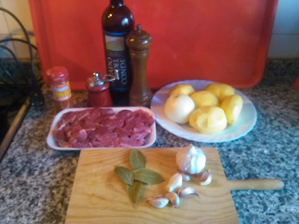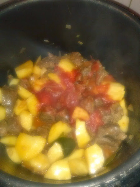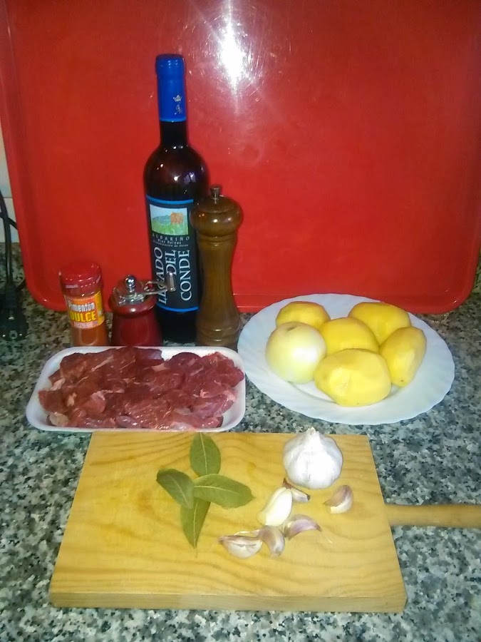 la dejamos unos minutos, y ponemos la cebolla, la Carlota, las hojas de laurel las patatas y los ajos que teníamos reservados, cuando notamos que la cebolla esta retiramos del fuego y ponemos el pimentón damos unas vueltas y le añadimos unas cucharadas de de tomate triturado, lo volvemos al fuego le damos otras vueltas y añadimos el vino . (Yo he utilizado un albariño , podéis utilizar cualquier otro pero cuando mejor sea el vino mejor sera su sabor )dejamos unos minutos y cubrimos de agua ,dejamos cocer fuego medio hasta que reconsideremos que la patata esta hecha