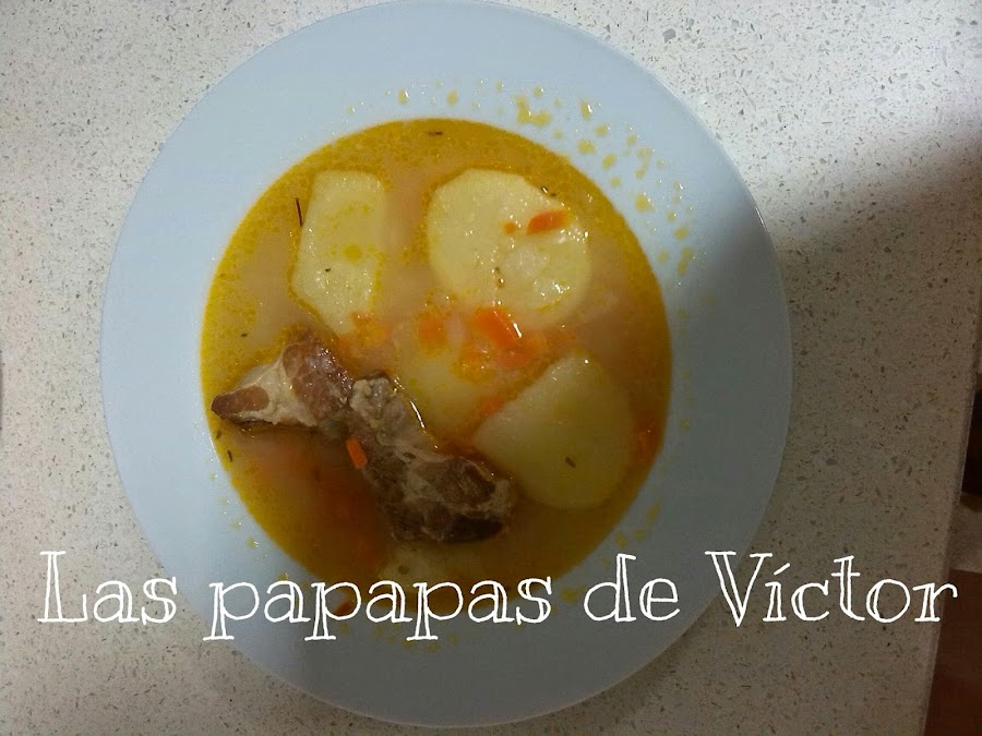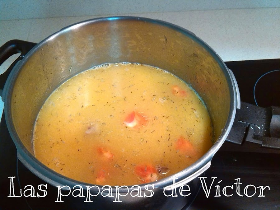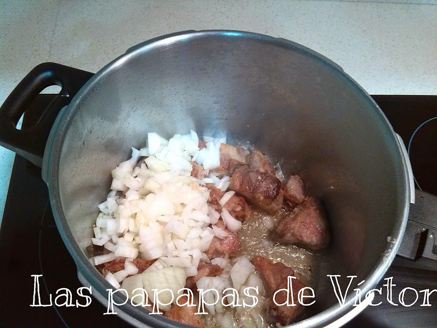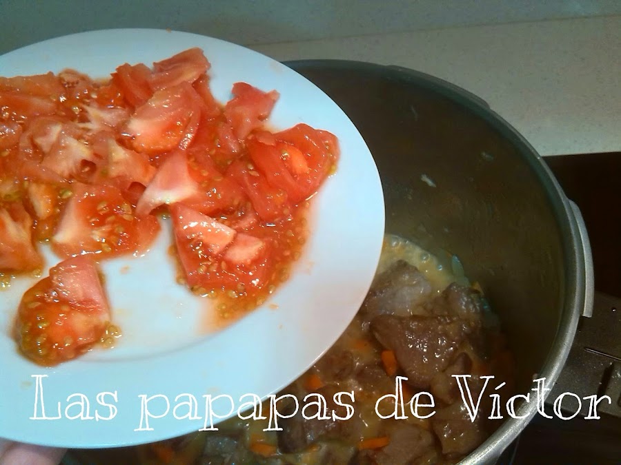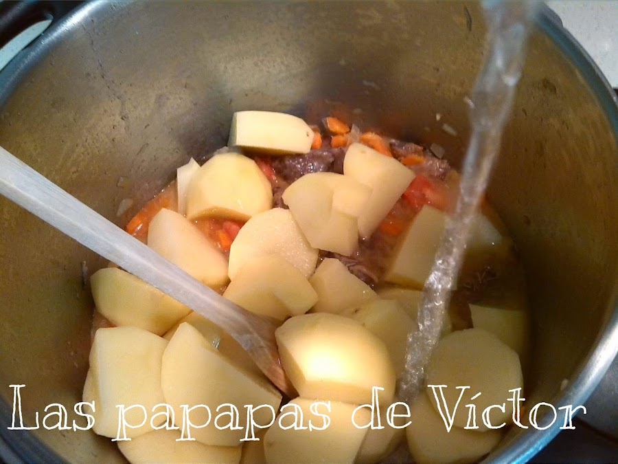 Una vez que este toda la verdura sofrita,añadir las patatas, dar unas vueltas con la cuchara e incorporar el agua hasta cubrir.