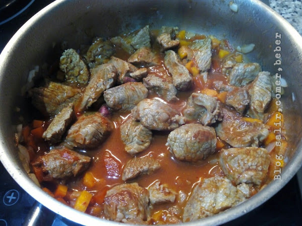 Esperamos a que se cocine el tomate y cubrimos con el vino tinto, lo cocinamos a fuego fuerte para que se evapore el alcohol unos dos o tres minutos bastarán y después bajamos el fuego y cocinamos a fuego lento hasta que la salsa reduzca y se espese (35 ó 40 minutos aproximadamente) en este punto, la carne debería estar tierna, si no fuese así, añadiríamos un poquito de agua y dejaríamos cocer hasta que se ablande.