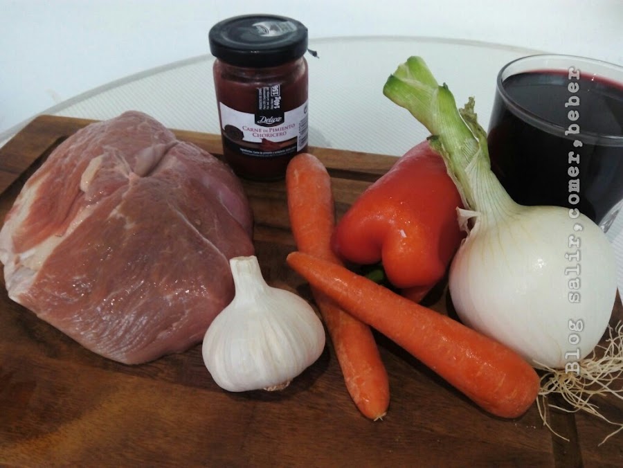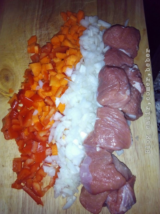 Aceite, pimienta y sal.Troceamos la pieza de carne en trozos lo más regulares posible, (la venden ya troceada si no queréis complicaros), picamos también nuestras verduras; la cebolla, la zanahoria y el pimiento.