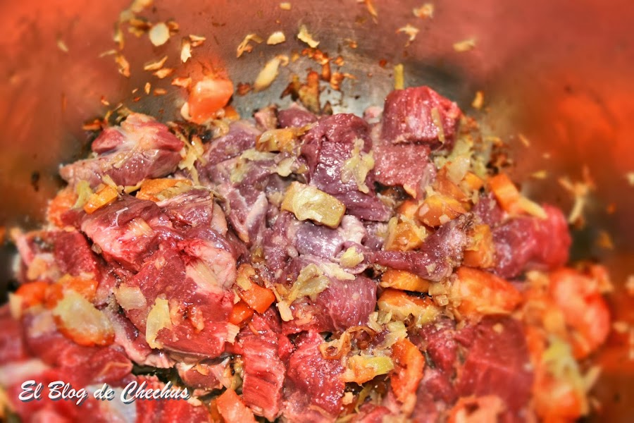 Echamos el caldo o el agua con la pastilla de ave, sin que llegue a cubrir la carne. Cerramos la olla y dejamos hasta el segundo anillo unos 12 minutos.