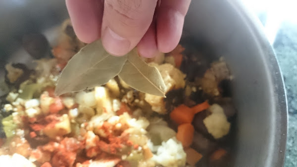 4.- Volcamos la verdura con la carne y añadimos las especias, el laurel, el tomate concetrado y el vaso de cerveza.