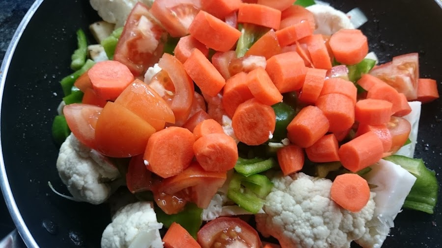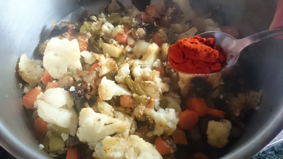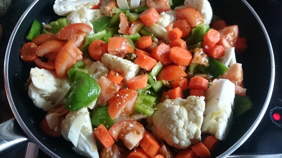 3.- En la misma sartén ponemos toda la verdura troceada y moreamos 5 minutos con un poco de aceite.