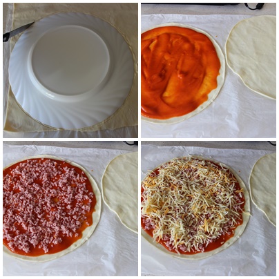 Si las láminas de hojaldre son redondas , las dejamos tal cual, y si son cuadradas las recortamos en forma circular con un plato como molde.