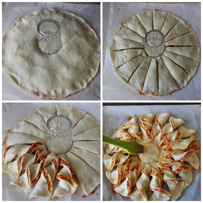 Le ponemos encima la otra lámina de hojaldre, apretamos los bordes y colocamos un vaso boca abajo en el centro, presionamos un poquito para marcar el centro y vamos cortando el círculo en 16 porciones... como se ve en las fotos.