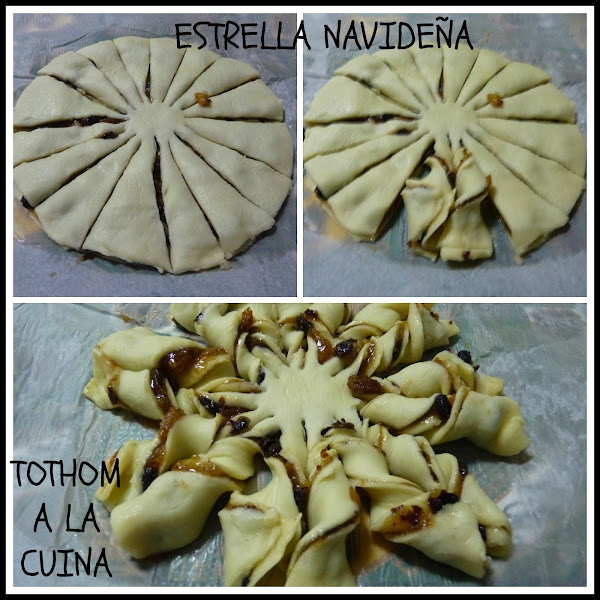 Y ahora viene el montaje. En grupo de dos porciones consecutivas: La que nos queda en la mano derecha, la "retorceremos" hacia dentro a la izquierda. La porción que nos queda en la mano izquierda, la "retorceremos" hacia dentro a la derecha. Seguiremos así con las dos siguientes. Al final nos quedarán 8 puntas. Ahora pincelaremos con leche y metemos en el horno hasta que esté dorada la estrella. Mejor comer templada.